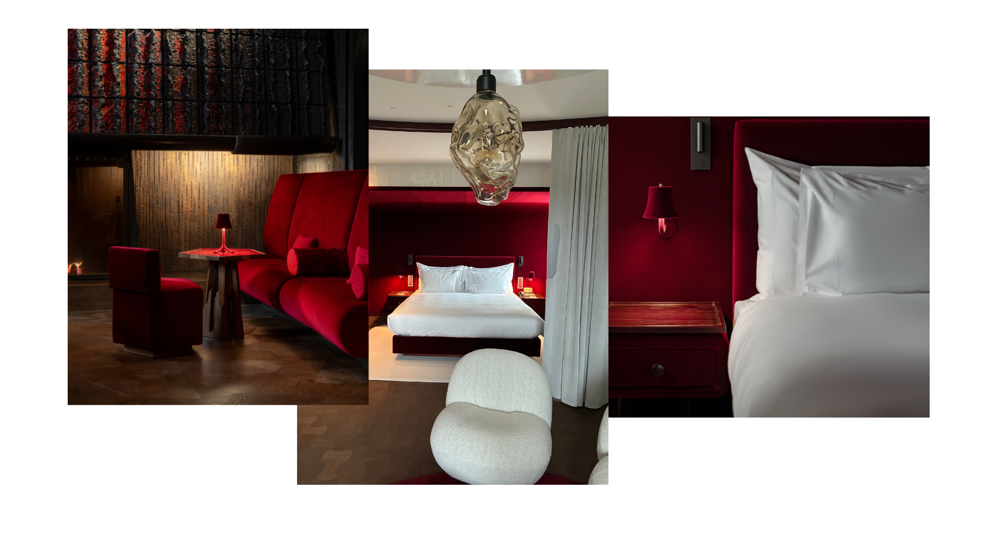Die sieben neuen Suiten erstrahlen in einem eklektischen Mix aus dunkel gebeizten Eichenholzmöbeln, schneeweißem Carraramarmor und auf Hochglanz lackierten Deckenelementen – eingebettet in einen Kokon aus tiefrotem Samt. Türen, Ecken oder Kanten sucht man vergebens – nichts, was die kreative oder gedankliche Freiheit begrenzen könnte. Stattdessen gehen Formen und Elemente nahtlos ineinander über. Sanfte Rundungen spiegeln das Wogen der Wellen am nahen Rhein wider.